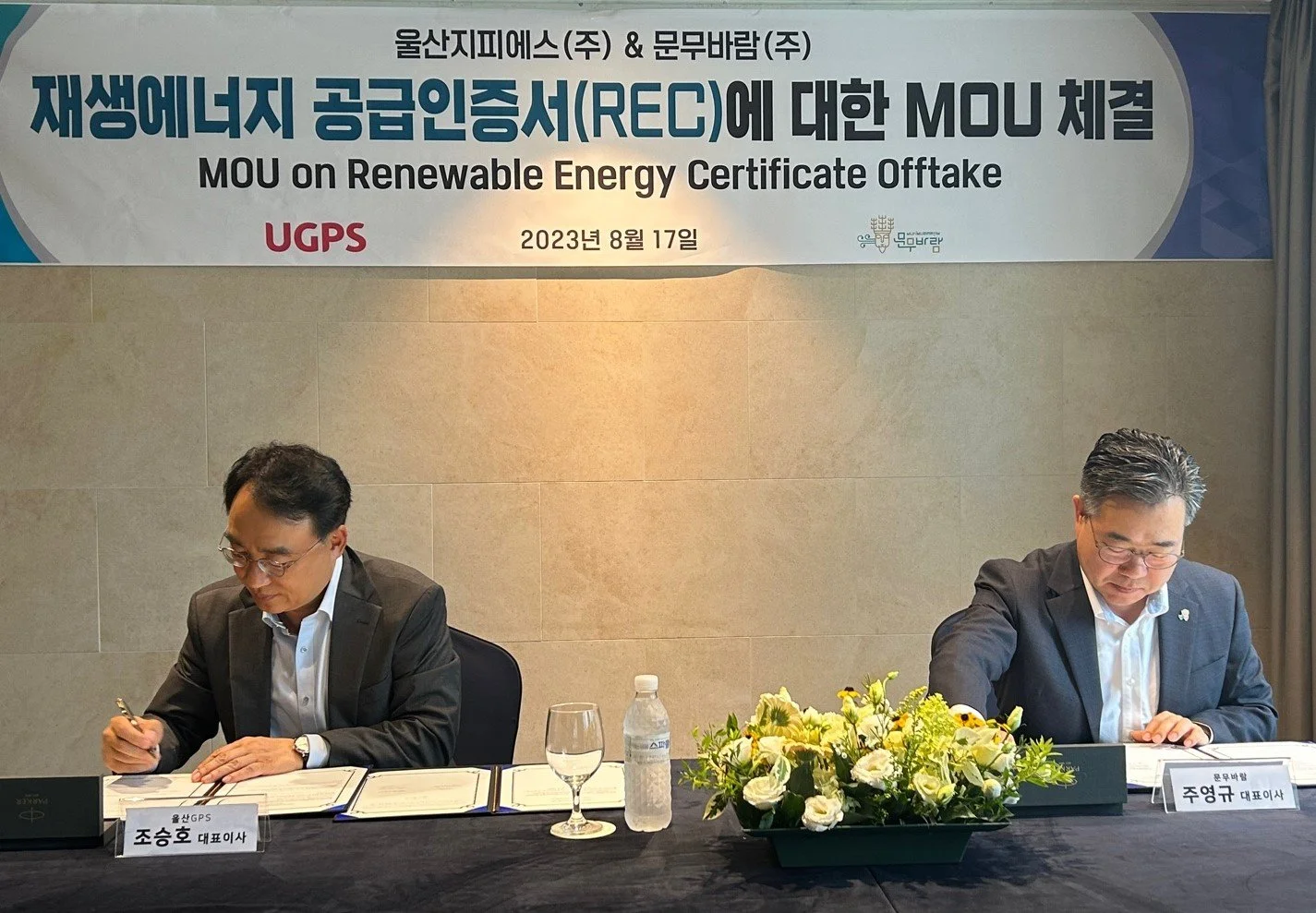 (2023년 8월 17일) 문무바람(주)은 울산지피에스(주)와 신재생에너지 공급인증서 장기 고정가격구매에 관한 양해각서를 체결하였습니다.